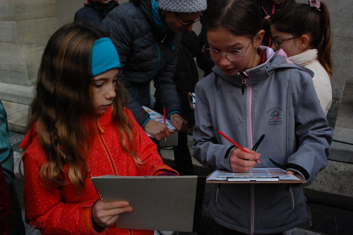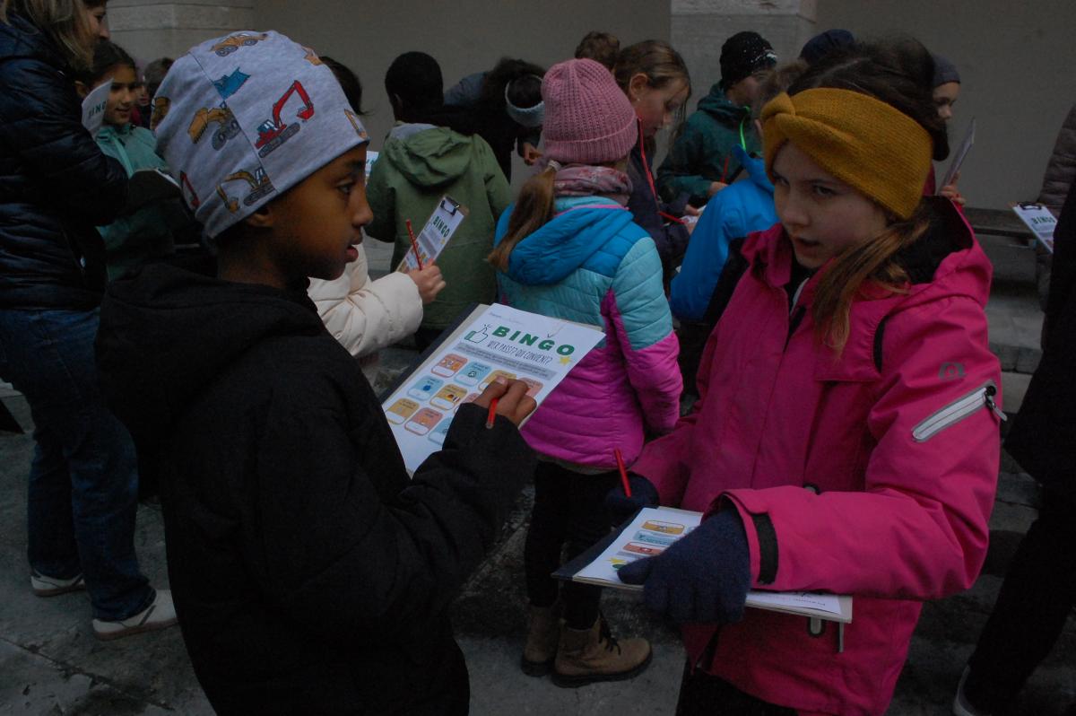 Der Vormittag im Innenhof des Museums stand ganz im Zeichnen des Kennenlernens. Mit Bingo, Bewegungsspielen und Sprachaufgaben gelang es, Hemmungen rasch abzubauen. Beim Kennenlern-Bingo erhielt jedes Kind ein Blatt mit verschiedenen Feldern, in denen kurze Aussagen standen - etwa „Je joue au football.“, „Ich habe eine Schwester oder einen Bruder.“ oder „J‘aime le chocolat.“. Die Aufgabe bestand darin, für jedes Feld eine passende Mitspielerin oder einen passenden Mitspieler zu finden. Dabei durften die Kinder aber nicht in der eigenen