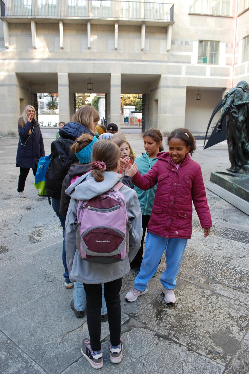 Der Abenteuer begann am Bahnhof Tecknau, wo wir die 4. Klasse aus Oltingen-Wenslingen kennenlernten. Im Kunstmuseum Basel angekommen, trafen wir dann auf die 14 Schülerinnen und Schüler aus dem Jura. Nach der zweisprachigen Bergüssung durch die Lehrpersonen Muriel Schaller-Berthold (Develier), Miriam Walter (Oltingen-Wenslingen) und Anne Pironnet sowie ein kurzes Znüni „goûter“ mit Totché (salzige Tarte, eine Spezialität aus dem Jura) startete das gemeinsame Programm.