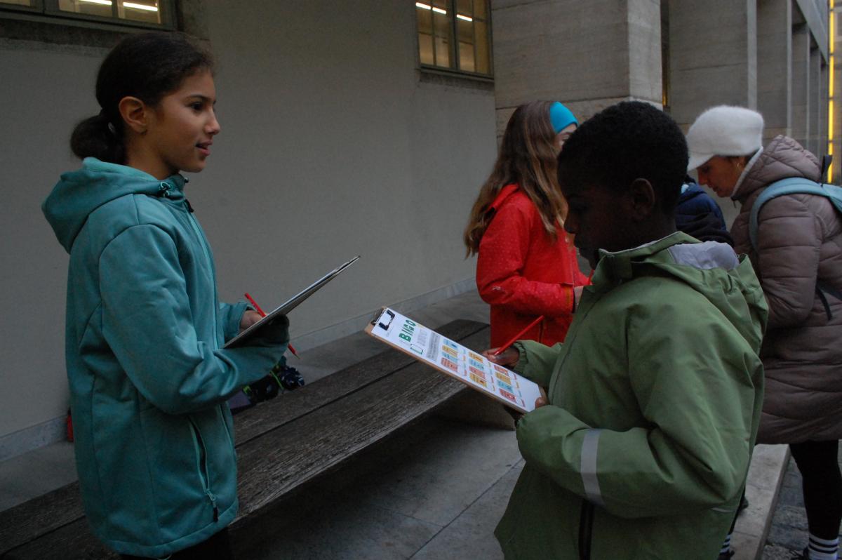 Der Vormittag im Innenhof des Museums stand ganz im Zeichnen des Kennenlernens. Mit Bingo, Bewegungsspielen und Sprachaufgaben gelang es, Hemmungen rasch abzubauen. Beim Kennenlern-Bingo erhielt jedes Kind ein Blatt mit verschiedenen Feldern, in denen kurze Aussagen standen - etwa „Je joue au football.“, „Ich habe eine Schwester oder einen Bruder.“ oder „J‘aime le chocolat.“. Die Aufgabe bestand darin, für jedes Feld eine passende Mitspielerin oder einen passenden Mitspieler zu finden. Dabei durften die Kinder aber nicht in der eigenen